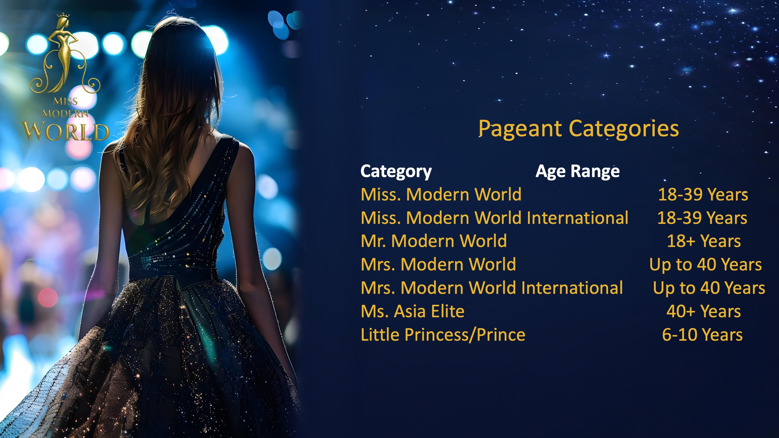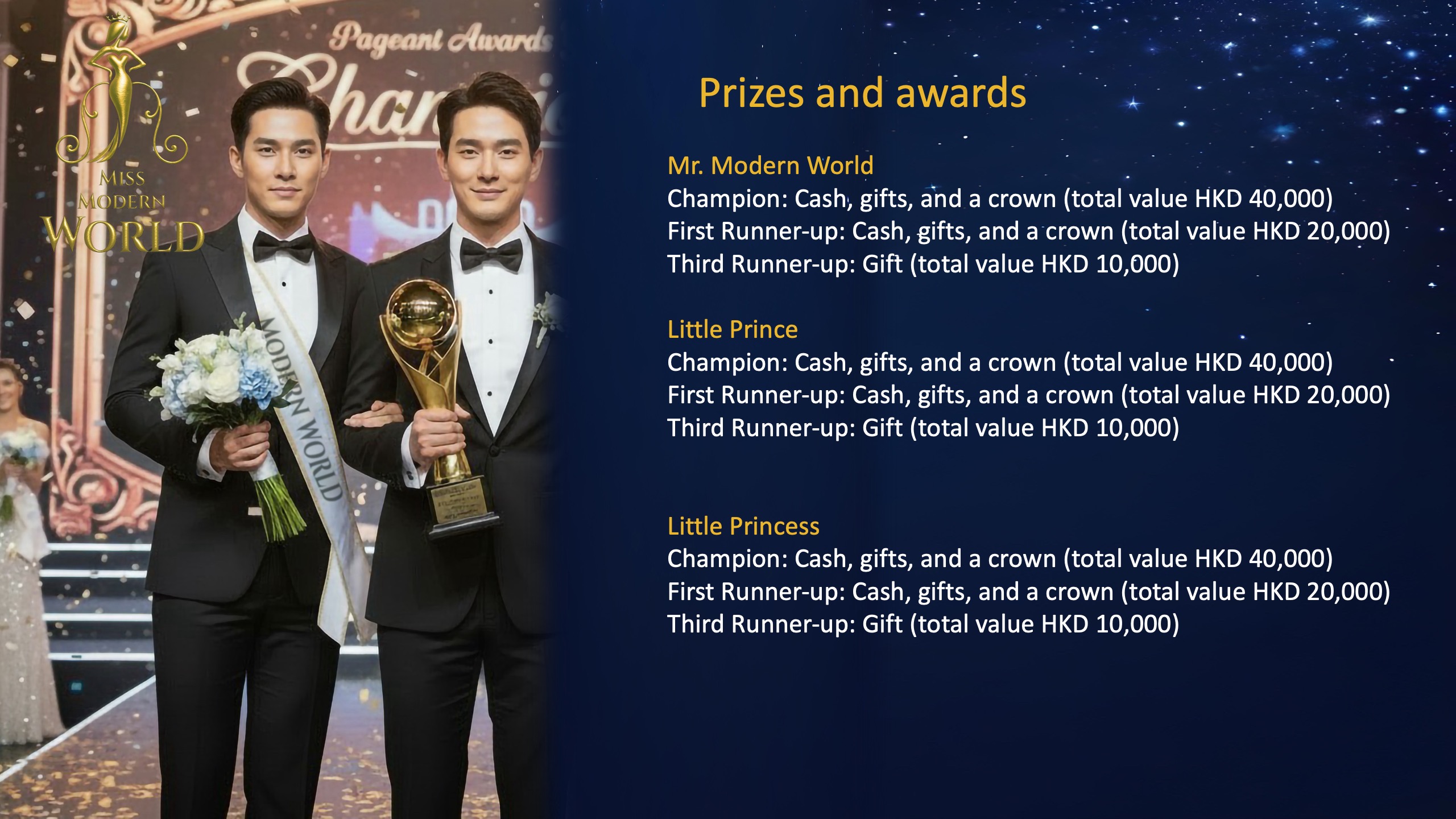 1.Miss Modern World International/ Mr Modern World /Mrs Modern World International 報名費用每位2, 500USD